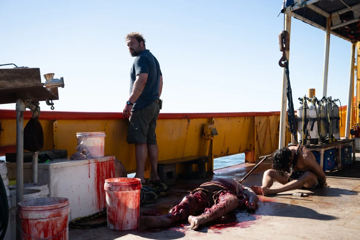 A rambunctious rogue whose boat-captain charisma conceals a sadistic streak, Tucker is an inspired creation, brought to life by the “Suicide Squad” actor with gregarious humor and more than a glint of madness. For Zephyr (Hassie Harrison), an American surfer running from her past, he’s a living nightmare. Soon after Zephyr lets her guard down upon meeting a friendly local named Moses (Josh Heuston), she’s brutally abducted by Tucker and taken aboard his boat, where he plots to orchestrate a feeding frenzy by lowering his victim into shark-infested waters. Resourceful and strong-willed, Zephyr fights tooth and nail to avoid this unfathomable fate.